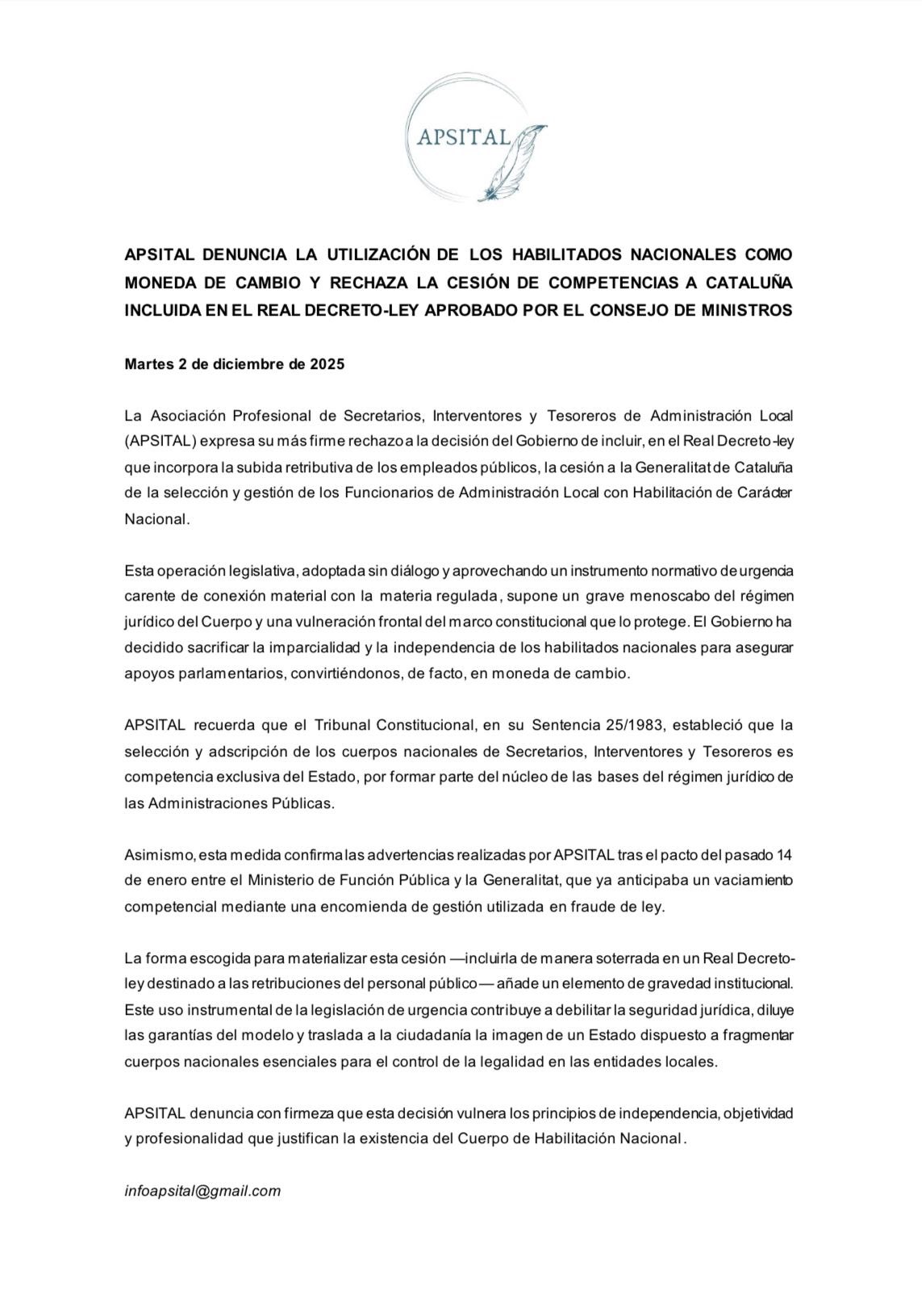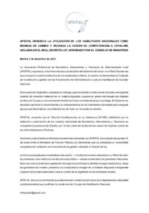 APSITAL denuncia la cesión a Cataluña de los Habilitados Nacionales a través del RD-ley que incorpora la subida retributiva de los empleados públicos